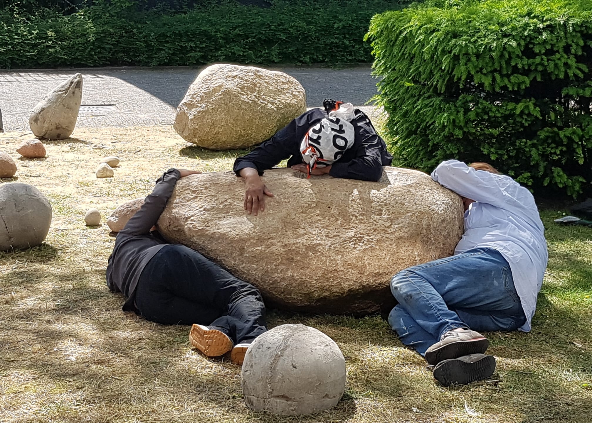 On September 2, from sunrise to sunset, the performance Cries in Concrete, Curses Curbstones, Dreams in Drywall, Rests in Rainfall took place at the Woldstrand in Zeewolde. In the midst of the boulders, performers Lidwien Ponsioen, Rose Akras, and Dianthus activated the site through the durational and laborious production of concrete, tear-shaped objects that accumulated over the course of the performance. Persistence, joy and fatigue informed the work as the day progressed, which is why the public was encouraged to attend the performance for a long period of time, to slow down, and perhaps even to spend several hours with the work, to see it grow and shift back and forth from a site of production to a mythological destination.