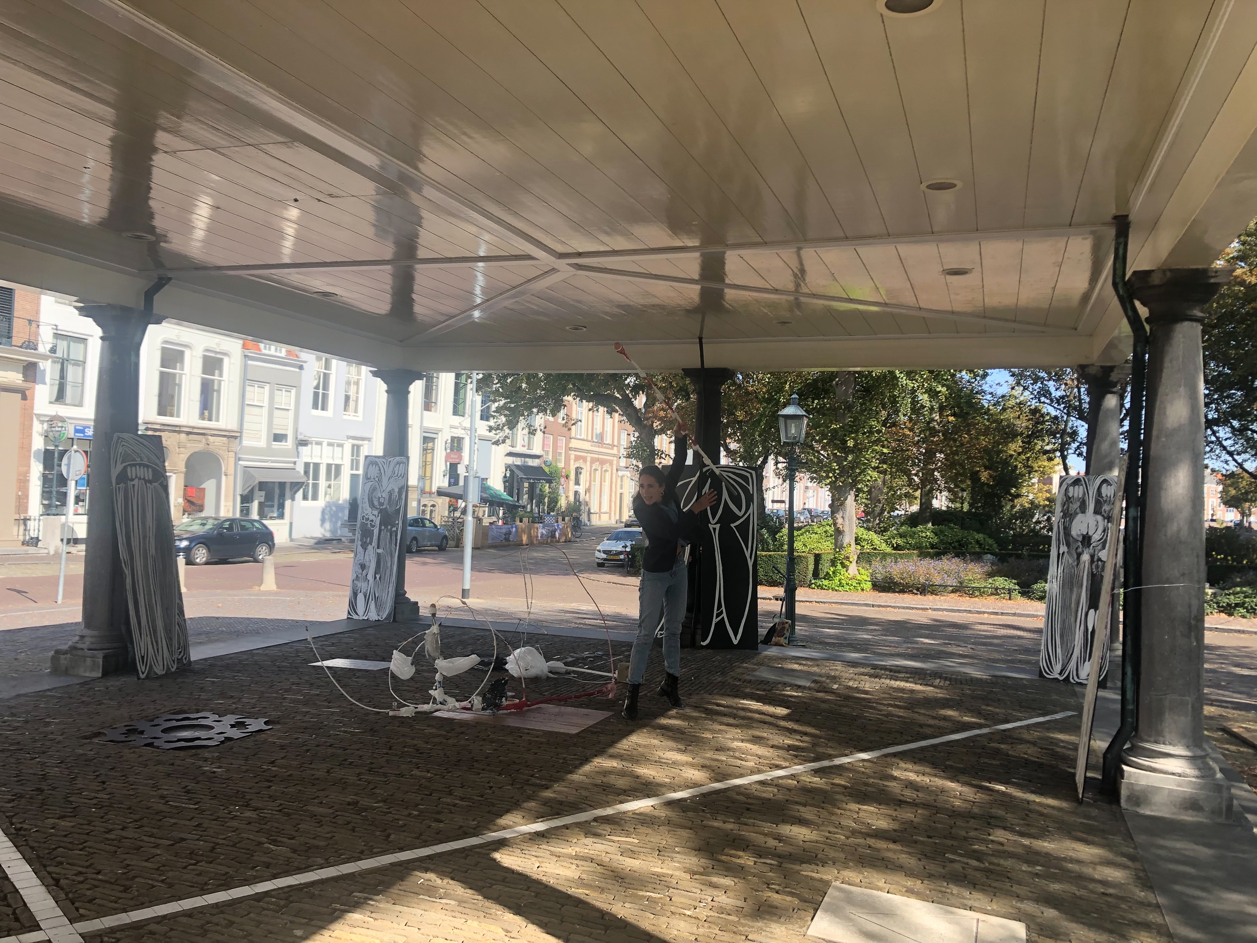 For the fifth edition of Rooms of Now, artist Sophie Schmidt was invited to develop a new performance, Cyborg Procession with Trennungsüberwindungsprothese and Tomatenfrauen. Instead of taking place in a private house, this edition of Rooms of Now took place in a public space that has been a 'home of the arts' for decades: the Podio del Mondo per l’Arte (1979) by Marinus Boezem at the former grain market located on Damplein in Middelburg.